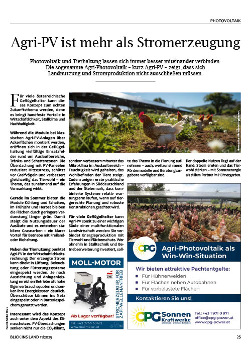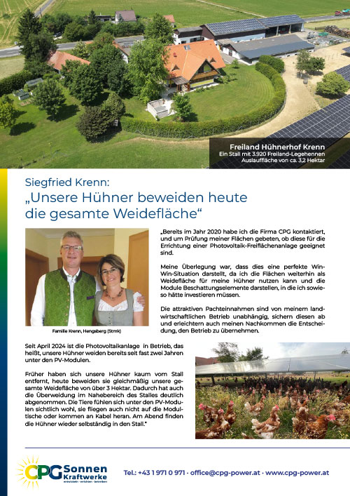 Immer mehr Geflügelbetriebe in Österreich verpachten ihre Auslaufflächen für die Errichtung und den Betrieb einer Agri-Photovoltaik-Freiflächenanlage. Die PV-Anlage spendet den Tieren Schatten, schützt sie vor Greifvögeln, und die Landwirte erzielen gleichzeitig ein attraktives Entgelt für Pacht und Pflege, das unabhängig von sonstigen landwirtschaftlichen Einkünften verlässlich jedes Jahr ausbezahlt wird.