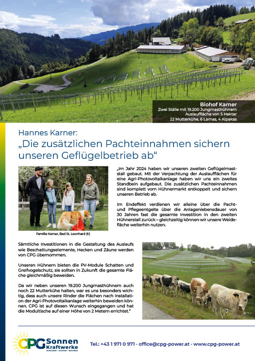 Auf der Weidefläche des Biohof Karner in Bad St. Leonhard in Kärnten errichten wir im Winter 2025 auf einer Fläche von ca. 4 Hektar eine Agri-Photovoltaikanlage mit einer Leistung von ca. 5.000 kWp. Herr Karner erklärt seine Entscheidung für die gemeinsame Umsetzung wie folgt: „Mit der Verpachtung der Auslaufflächen für eine Agri-Photovoltaikanlage haben wir uns ein zweites Standbein aufgebaut. Die zusätzlichen Pachteinnahmen sind komplett vom Hühnermarkt entkoppelt und sichern unseren Betrieb ab. Im Endeffekt verdienen wir alleine über die Pacht- und Pflegeentgelte über die Anlagenlebensdauer von 30 Jahren fast die gesamte Investition in den zweiten Hühnerstall zurück – gleichzeitig können wir unsere Weidefläche weiterhin nutzen.“