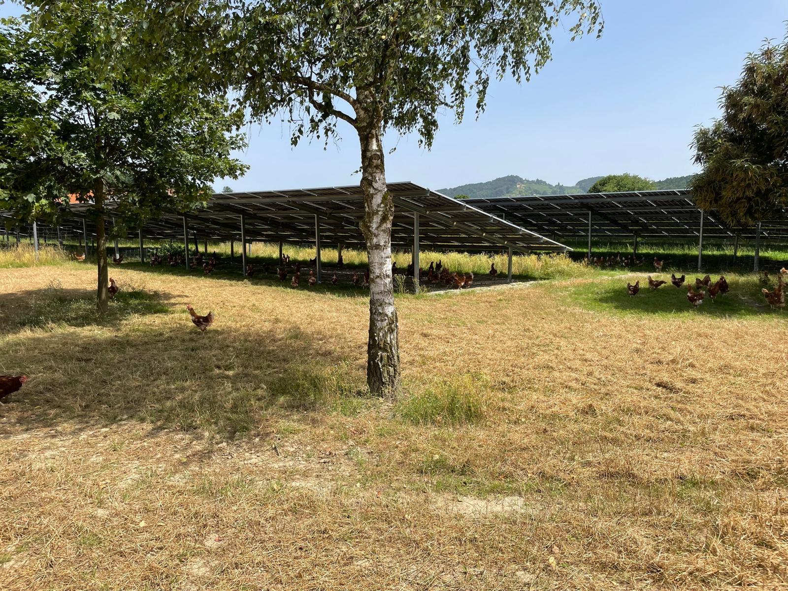 Unsere Agri-Photovoltaikanlage auf der Hühnerweide der Familie Krenn in Hengsberg in der Steiermark ist seit April 2024 in Betrieb. Die Anlage stellt den 3.920 Freiland-Legehennen somit bereits zwei Jahre Beschattungselemente zur Verfügung, in die der Betrieb ansonsten selbst hätte investieren müssen. Herr Krenn fasst seine Erfahrungen zusammen: „Früher haben sich unsere Hühner kaum vom Stall entfernt, heute beweiden sie gleichmäßig unsere gesamte Weidefläche von über 3 Hektar. Dadurch hat auch die Überweidung im Nahebereich des Stalles deutlich abgenommen. Die Tiere fühlen sich unter den PV-Modulen sichtlich wohl, sie fliegen auch nicht auf die Modultische oder kommen an Kabel heran. Am Abend finden die Hühner wieder selbständig in den Stall.“