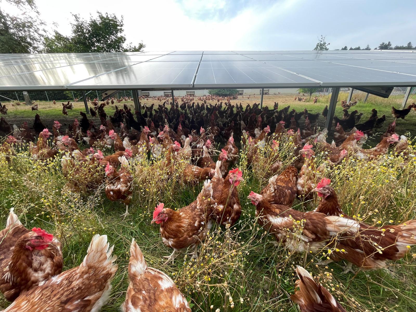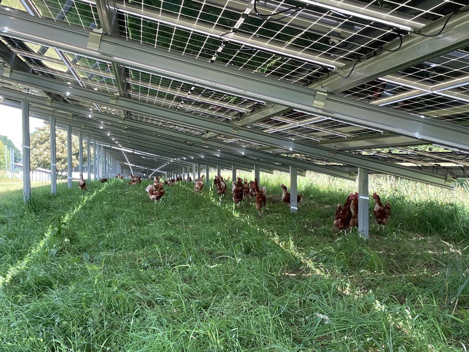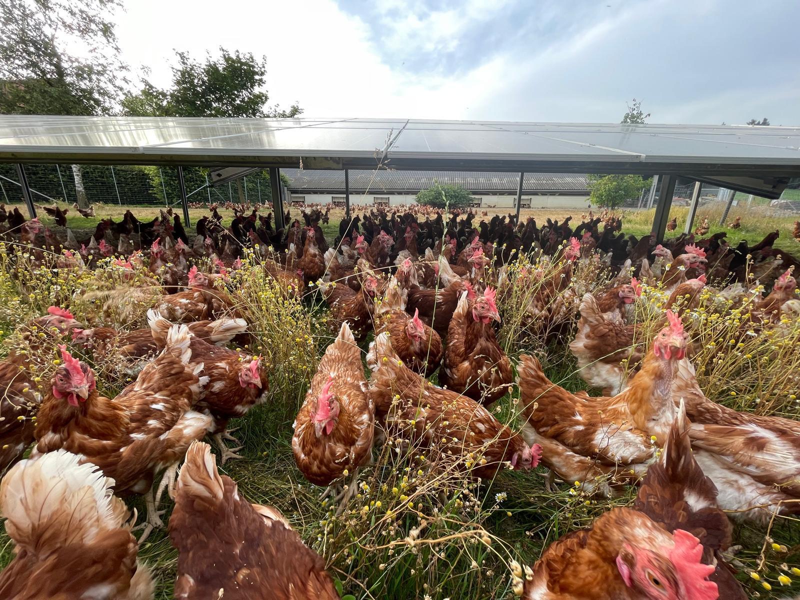 Die Installation von Photovoltaikpaneelen auf den Weideflächen bietet den Hühnern Schutz vor Witterungsereignissen (Hitze, Hagel, Starkregen etc.) und Greifvögeln. Wenn die Module gleichmäßig auf den Flächen verteilt werden, führt die Agri-PV-Anlage zu einer gleichmäßigen Nutzung der gesamten Weidefläche, der Hitzestress der Tiere wird reduziert und das Wohlbefinden gesteigert, was letztendlich zu gesünderen Hühnern und einer höheren Eiqualität führt.